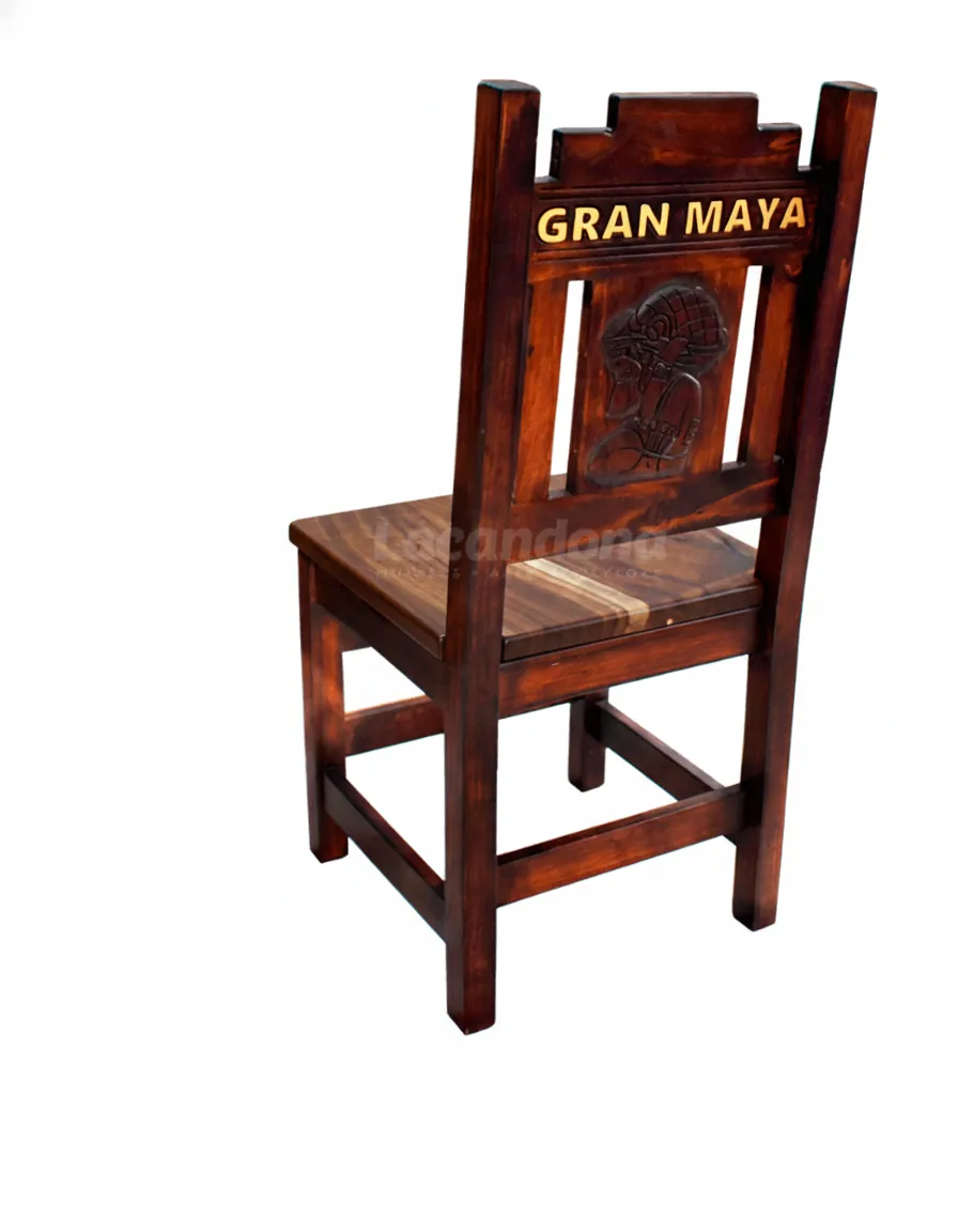 Transforma tu restaurante temático con la Silla Maya, una pieza rústica de mobiliario para restaurantes de alta calidad. Este modelo destaca por su respaldo tallado con motivos prehispánicos y una estructura reforzada con travesaños. Es la opción ideal para negocios que buscan proyectar autenticidad mexicana y ofrecer máxima calidad en mobiliario a sus comensales.