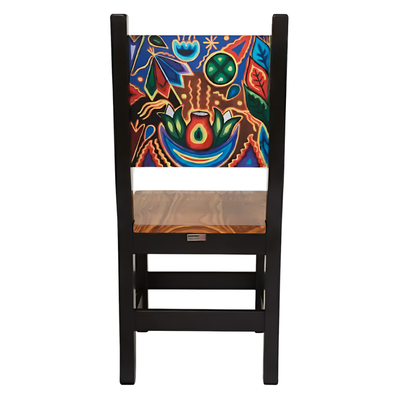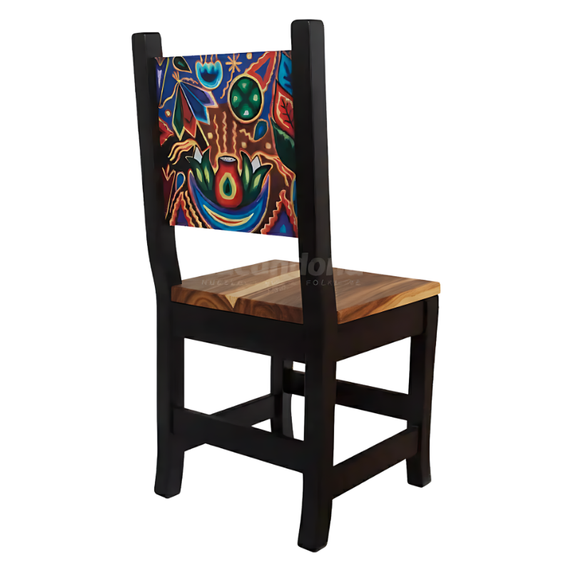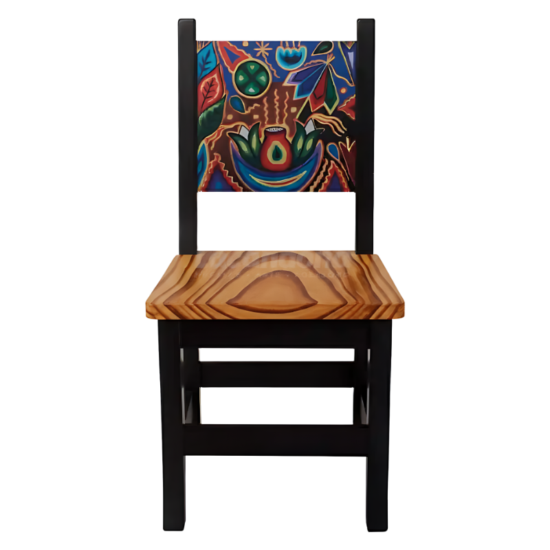 Transforma tu restaurante con la vibrante energía del México profundo con la Silla Sol y Luna, una silla que combina la estructura sólida de la madera en tinta oscura con un respaldo decorado con iconografía inspirada en el arte huichol. Es una pieza perfecta para restaurantes mexicanos que desean ofrecer una experiencia cultural completa, uniendo durabilidad con estética artesanal de alta calidad.