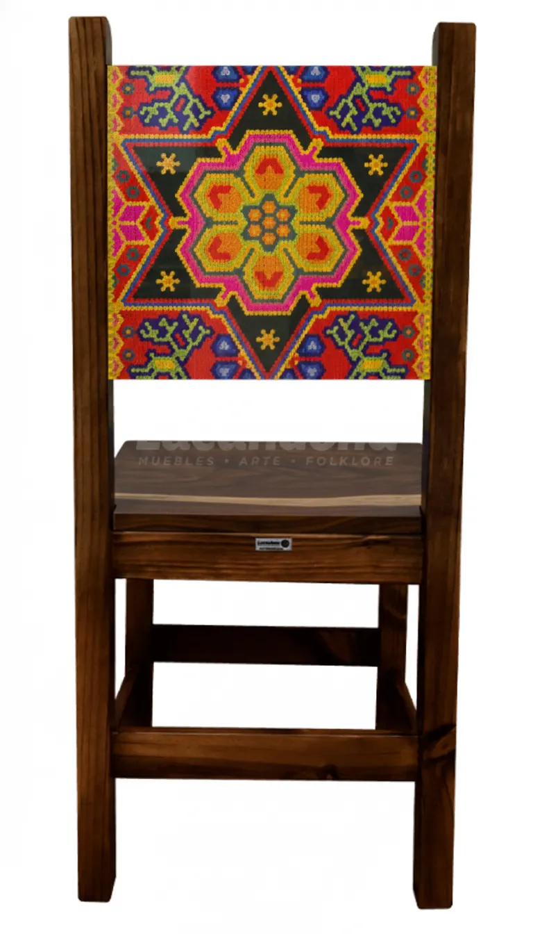 Silla para restaurante mexicano, con esencia artesanal y auténtica, inspirada en el arte huichol tradicional de México. Nuestra Silla Chaquira abarca un respaldo vibrante que refleja los complejos patrones geométricos y la simbología espiritual de la chaquira.