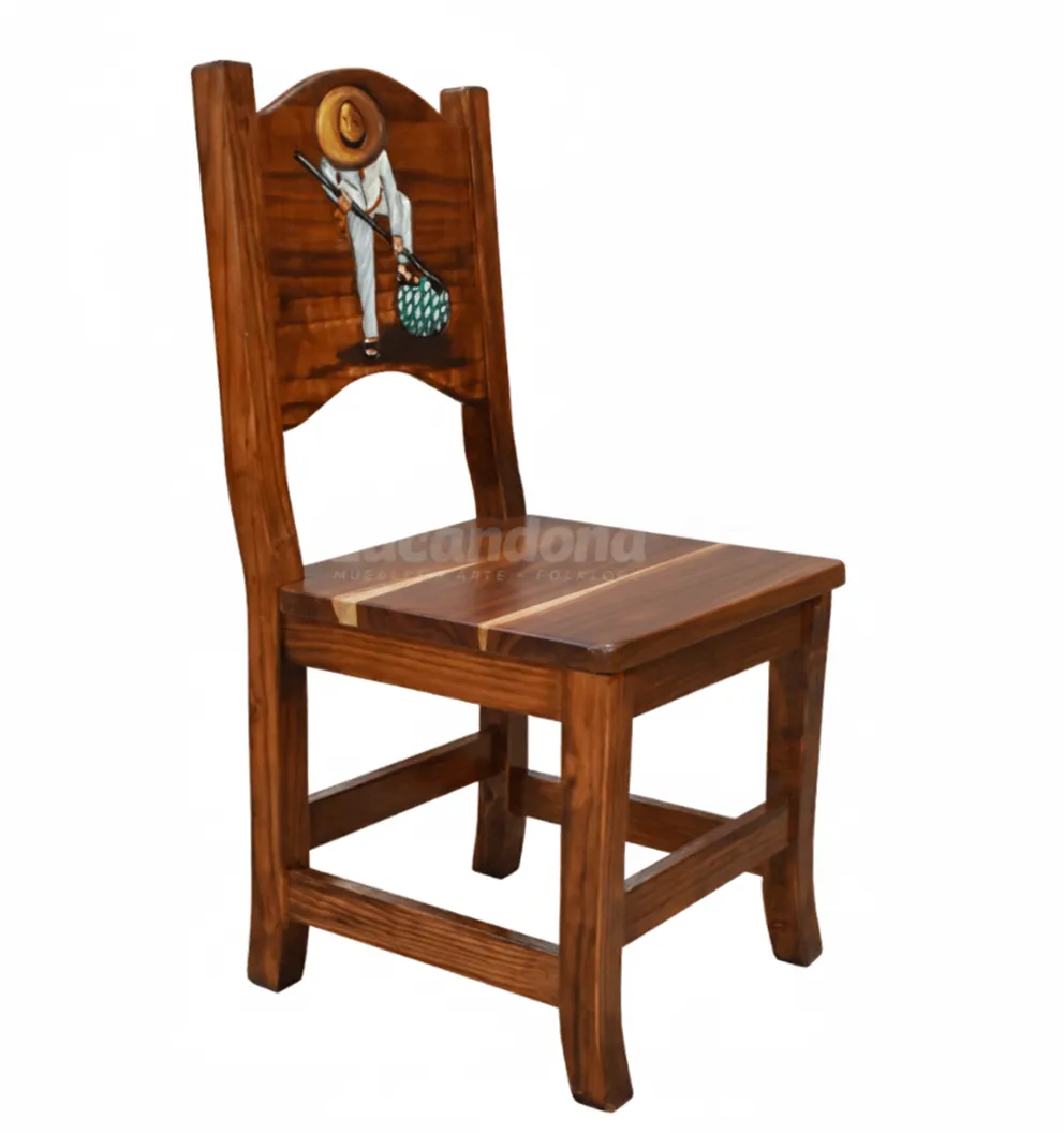 Aporte el alma de México a su restaurante tradicional con nuestra Silla Celaya. Esta pieza no es solo un asiento, es una obra de arte funcional que captura el oficio de la cosecha del agave. Su respaldo tallado y pintado muestra a un jimador en plena labor, ideal para restaurantes mexicanos con este concepto, cantinas u otro establecimiento que se apropie del estilo tequilero.